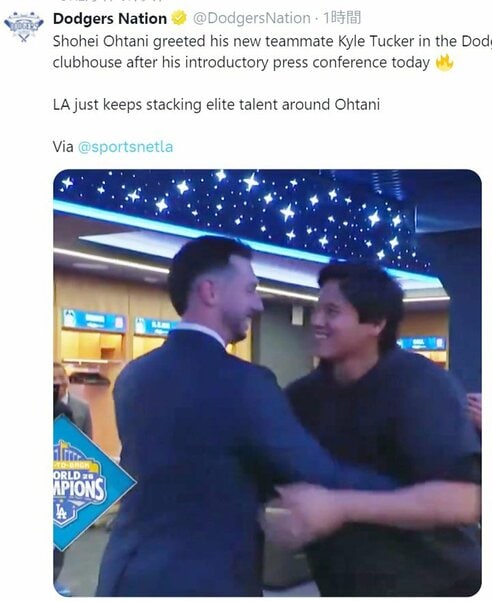 | 大谷翔平が「マジでデカすぎ」 新チームメートと2ショットにファン沸く「タッカーが細く見える」「最高で最強!」 ドジャース・大谷翔平投手(31)と新たなチームメートとの2ショットにファンが沸いている。 ドジャースの公式カメラマンを務めるジョン・スーフー氏が… (出典:スポーツ報知) |